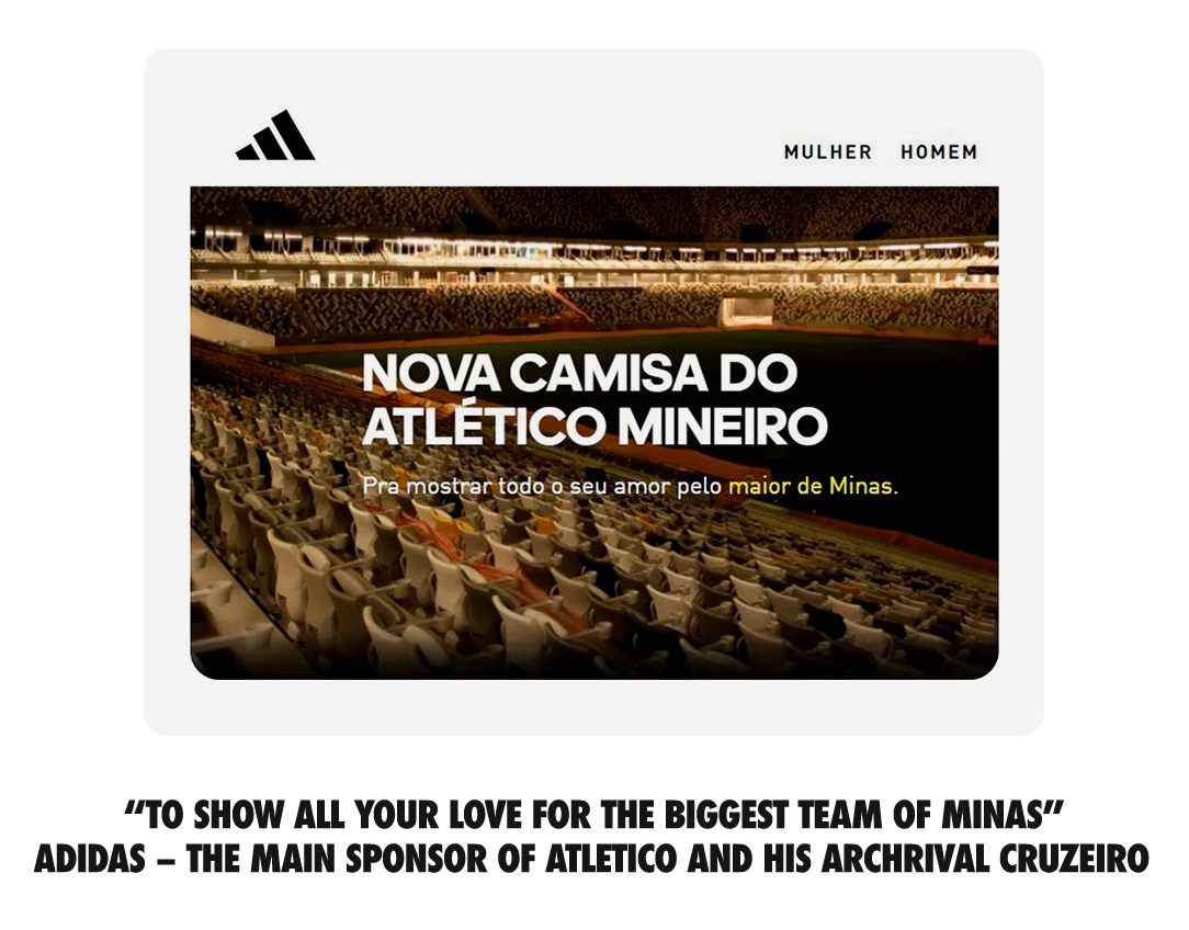 In 2023, while sponsoring the two main teams from Minas Gerais, one of Brazilian Football's biggest rivalries, Adidas wrongly claimed Clube Atlético Mineiro was the biggest. In 2025, Nike seized the opportunity to partner with Atletico by using a 15-meter billboard to announce its new sponsorship, in an unapologetic statement that took over the city, leaving Adidas and Cruzeiro as Minas’ second-largest club and brand sponsor.